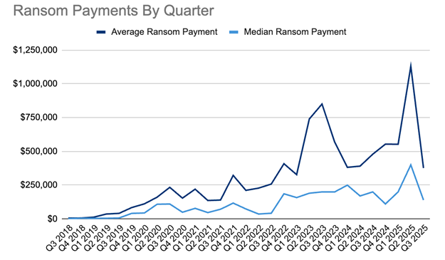 The Average Ransom Payment — $376,941 (down 66% from Q2 2025) — and the Median Payment — $140,000 (down 65%) — both declined substantially in Q3 2025. This reflects the intersecting dynamics of two trends: