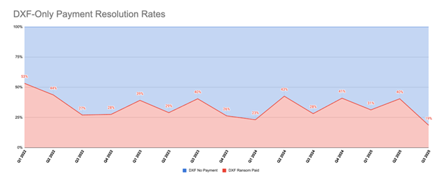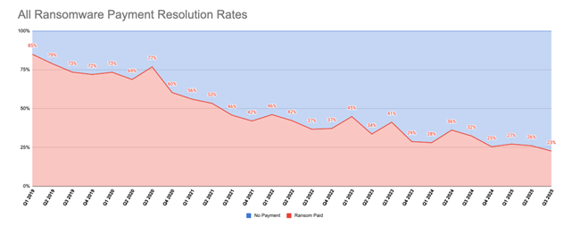 Ransom payment rates across all impact scenarios — encryption, data exfiltration, and other extortion — fell to a historical low of 23% in Q3 2025. This continuation of the long-term downward trend is something all industry participants should take a moment to reflect on: that cyber extortion’s overall success rate is contracting.