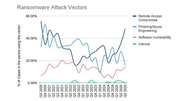 Remote access compromise remained the dominant vector, accounting for more than half of all observed incidents. Credential-based intrusions through VPNs, cloud gateways, and SaaS integrations continued to drive compromise, particularly in organizations navigating infrastructure migrations or complex authentication models. Even where technical patching was current, attackers found success exploiting lingering configuration debt such as old local accounts, unrotated credentials, or insufficiently monitored OAuth tokens.