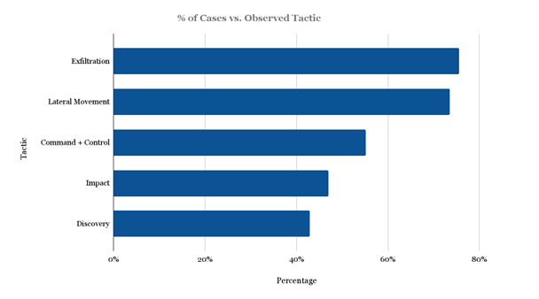 Discovery maintained its position in the Top 5, observed in 43% of cases and growing steadily. Modern extortion operations are increasingly data-driven: before exfiltration begins, attackers conduct deliberate reconnaissance to identify the systems, users, and datasets most likely to yield leverage. These activities often rely on built-in administrative commands or third-party utilities, making them difficult to distinguish from legitimate IT operations. Yet this same reconnaissance phase represents one of the most critical opportunities for early detection. Organizations capable of spotting anomalous enumeration or privilege mapping can intercept an attack at its most formative stage before data theft turns into negotiation leverage.