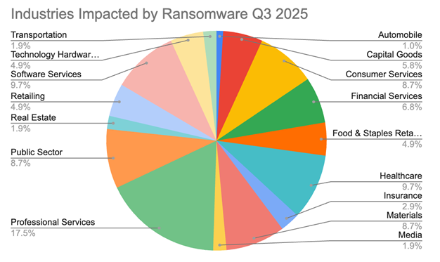 Ransomware attacks in Q3 remained largely opportunistic, driven by whatever entry points are most accessible: unpatched vulnerabilities, exposed remote access, or compromised credentials. Threat actors continue to exploit common technologies and misconfigurations rather than target specific industries, focusing instead on scale and ease of access. If RaaS groups begin to pivot their efforts towards more targeted attacks, we should expect to see evidence of this evolution in the industry data.