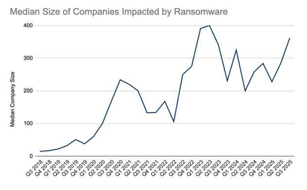 The median company size of enterprises impacted by a cyber extortion incident was 362 employees (up 27% from Q2 2025) in Q3 2025. The fact that payment frequency and payment amounts are down — a notable paradox that challenges the “big game hunting” assumption that larger targets guarantee bigger payouts. This suggests that while attackers may invest more to reach larger organizations, the return on investment is not assured.