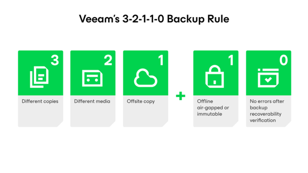 2. Follow 3-2-1-1-0 rule: 3 copies, 2 different devices, 1 offsite, air-gapped, and immutable, securely restored