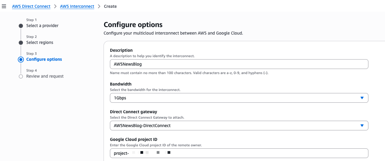 AWS interconnect - 2On step 3, I enter Description,I choose the Bandwidth, the Direct Connect gateway to attach, and the ID of my Google Cloud project.