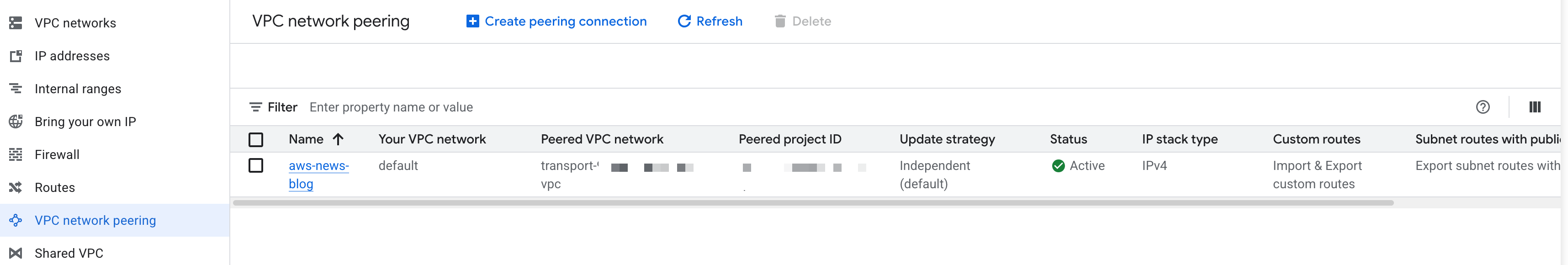 Step 2: create the transport and VPC Peering resources on my Google Cloud Platform (GCP) account.